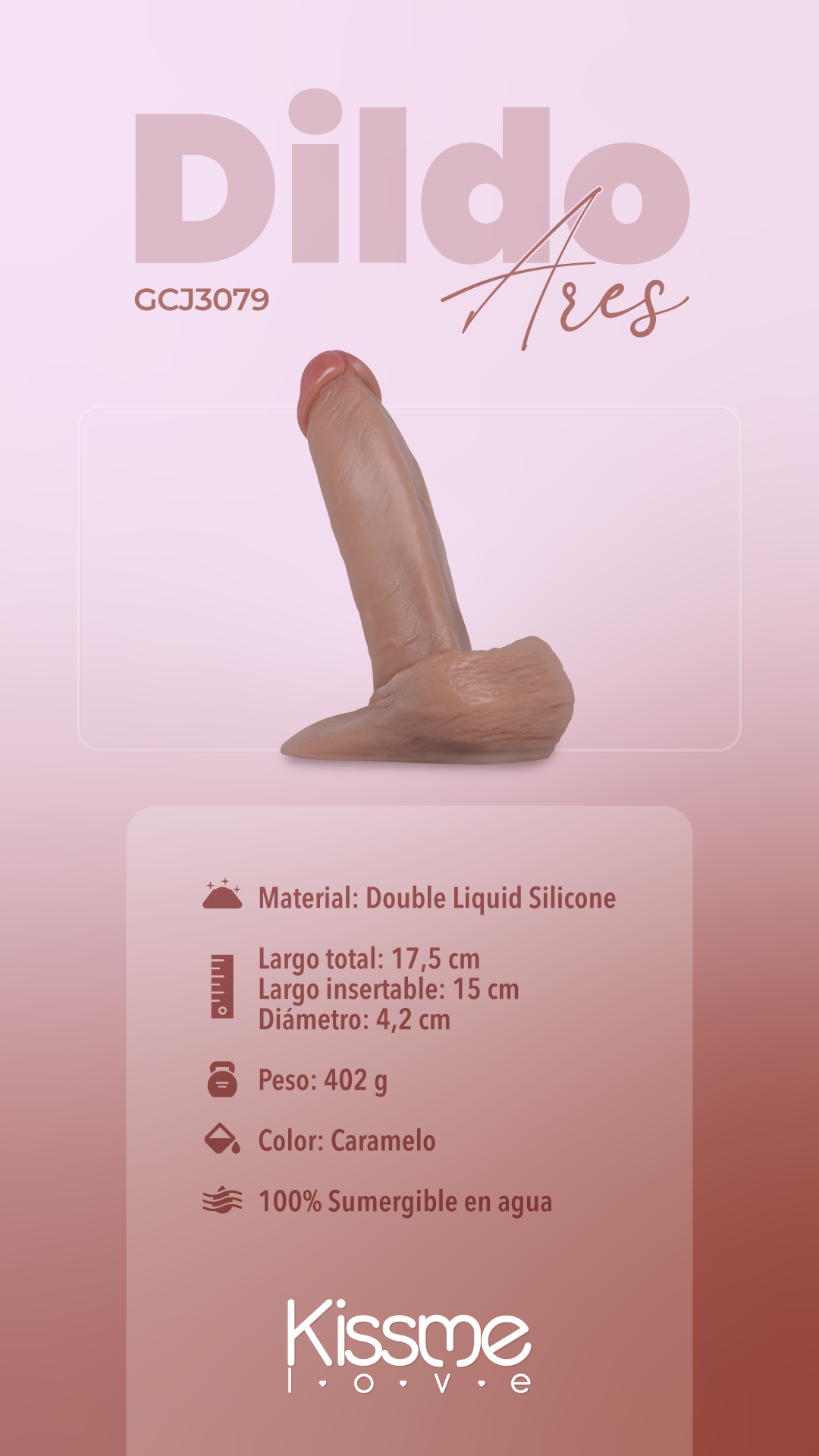 Pene realista con testículos y una base firme para adherirse a superficies planas y hacer un juego a manos libres.