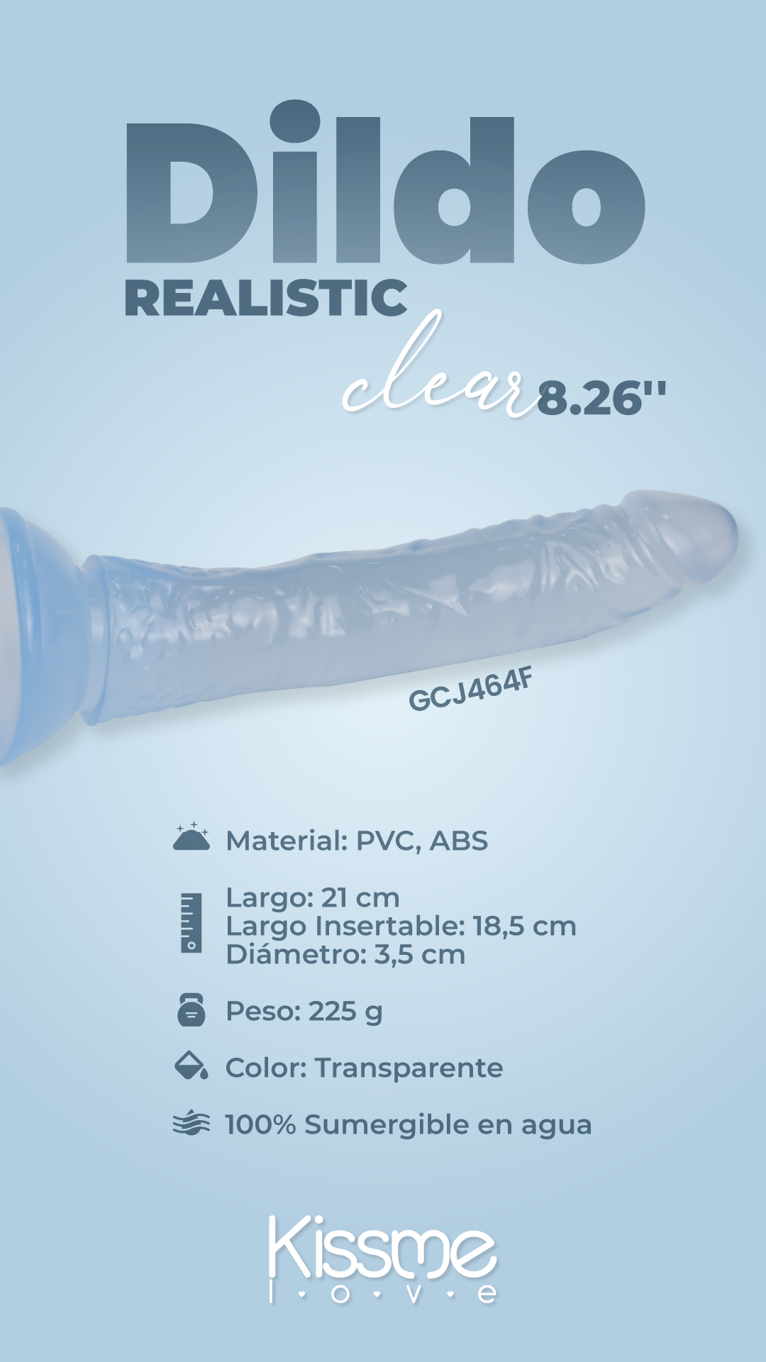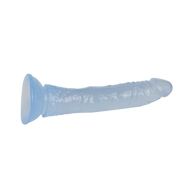 Dildo con forma fálica y cuerpo venoso. Cuando con ventosa en la base para adherirse a superficies planas y hacer un juego libre de manos.