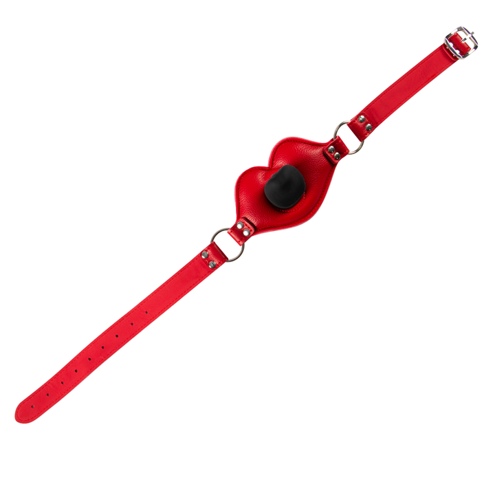 Correa con forma externa de labios y extensión interior de chupete en forma de pene para juegos fetish y prácticas BDSM.