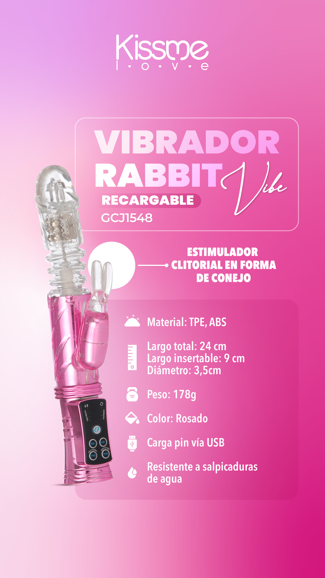 Vibrador con perlas rotativas, movimientos verticales y horizontales y un estimulador clitorial en forma de conejo para una estimulación placentera.