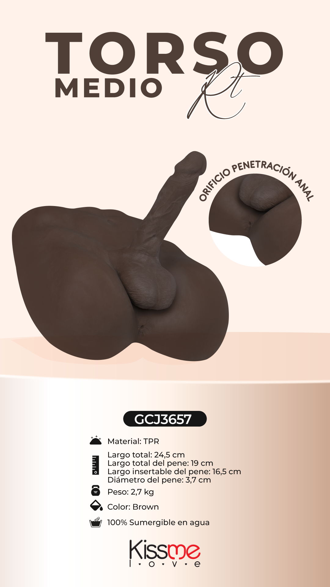 Torso medio cuerpo con pene y orificio para penetración anal. Cuenta con una vértebra interna que le da flexibilidad a las posturas.